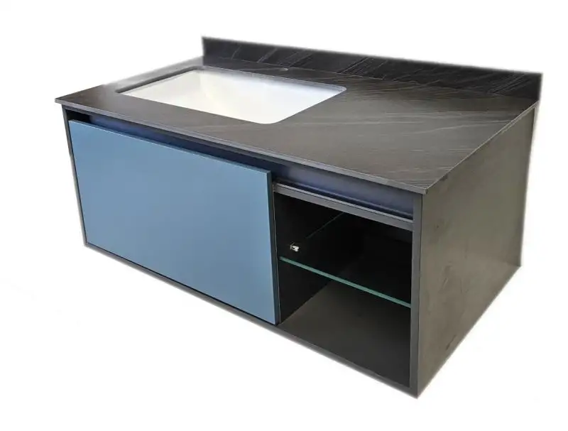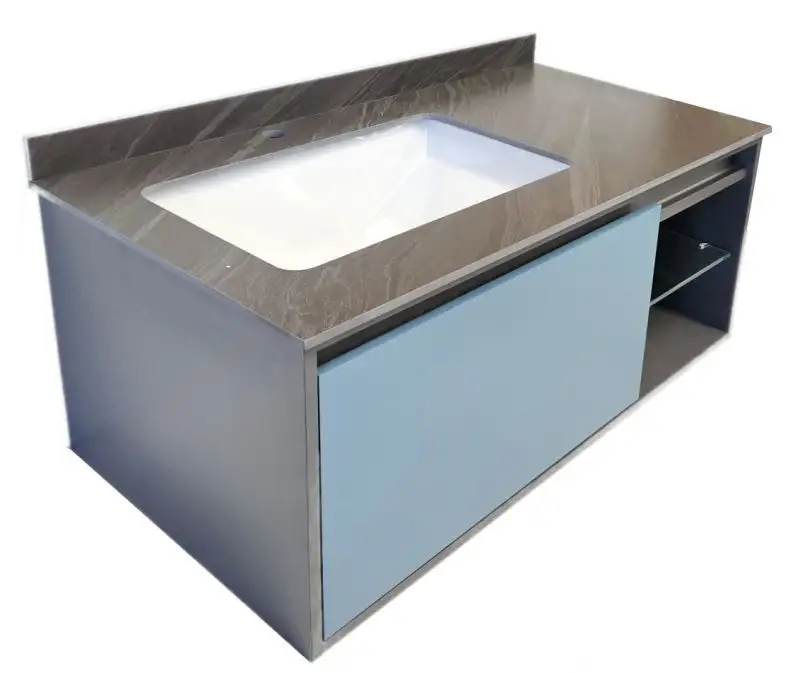 In culori de albastru si gri, acest set mobilier baie de 100cm se armonizeaza cu orice decor. Finisajul sau lucios creeaza impresia de lux, in timp ce placajul hidrofugat asigura durabilitate si rezistenta la umezeala.