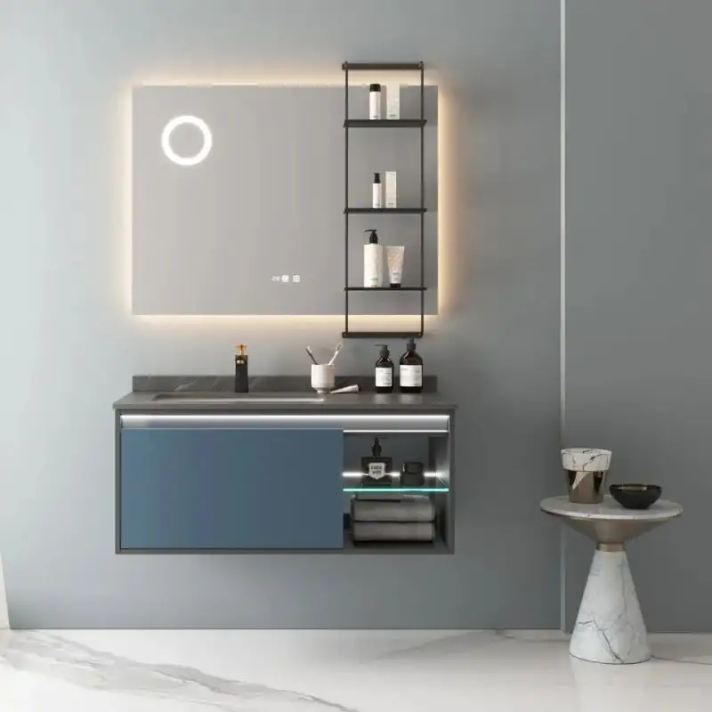Set mobilier baie suspendat, 3 piese, 100cm, albastru, gri, lucios