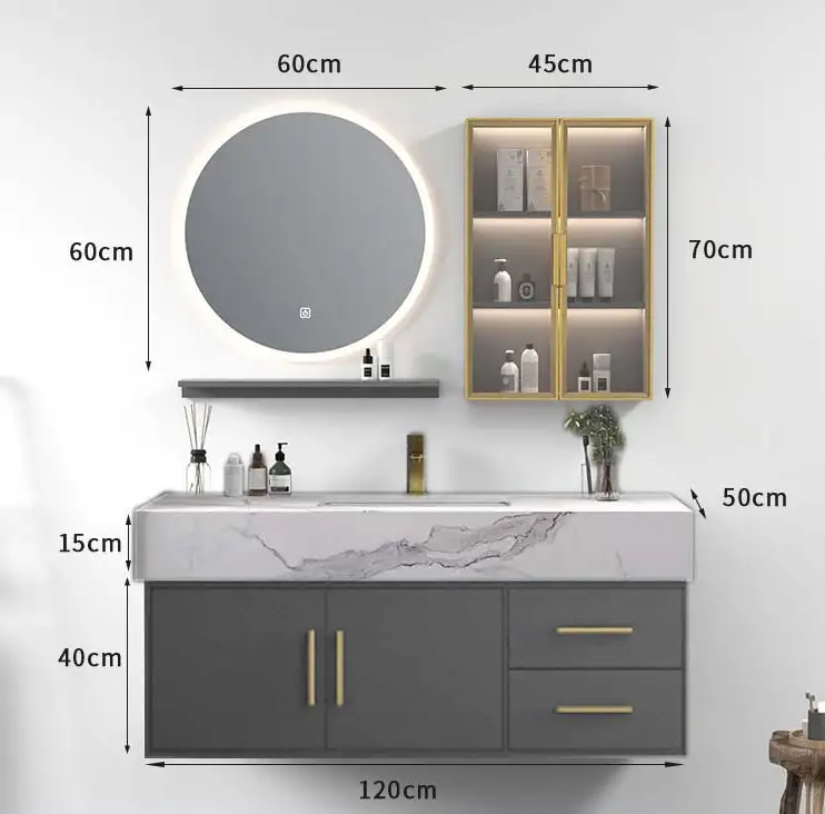 Exista un blat ceramic rezistent impotriva umezelii, un lavoar ceramic sub blat cu preaplin, oglinda LED cu buton touch si diametru de 60cm, etajera suspendata cu 3 polite pentru organizare eficienta si baza setului de mobilier de baie cu sertare cu inchidere lenta (soft close) si usa cu balamale soft close, pentru o experienta cat mai placuta si sigura pentru nevoile tale.