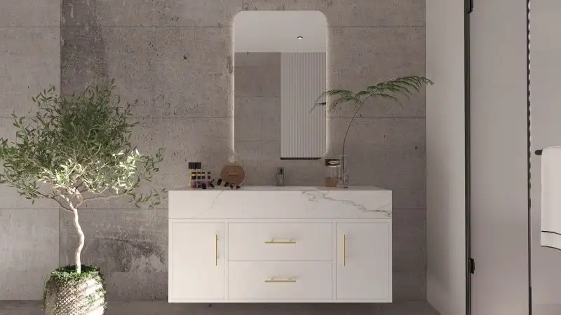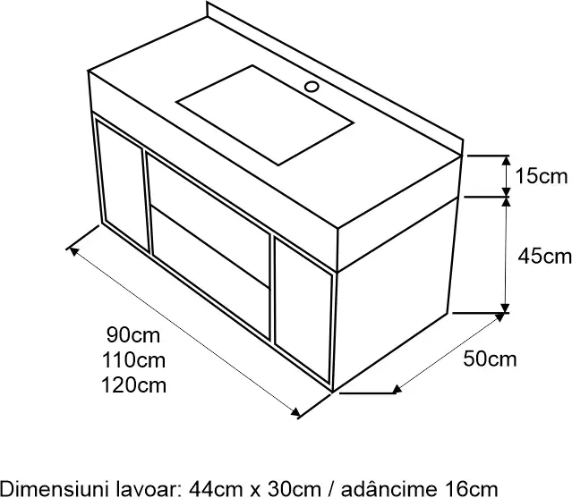 Blatul din compozit ceramic, cu dimensiuni de 120x15x50 cm, este pregatit pentru montajul bateriei sanitare, iar lavoarul ceramic, cu preaplin, este montat sub blat, conferindu-i un aspect elegant si practic in acelasi timp.