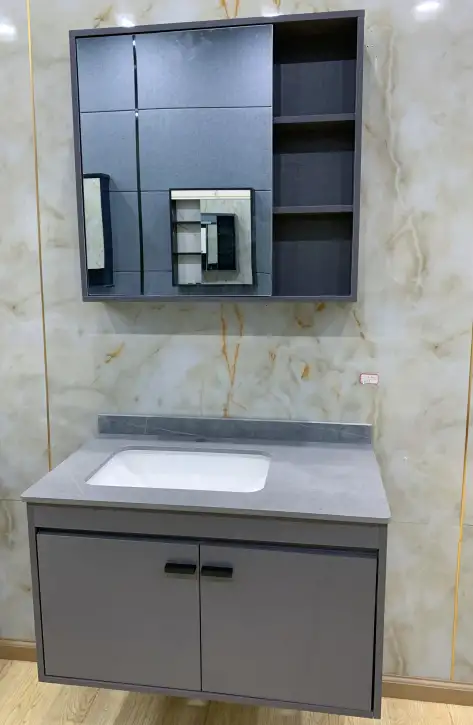 Acest set mobilier pentru baie moderna are un dulap cu oglinda, menit sa ofere spatiu de depozitare si iti permite sa faci mai multe lucruri deodata.
