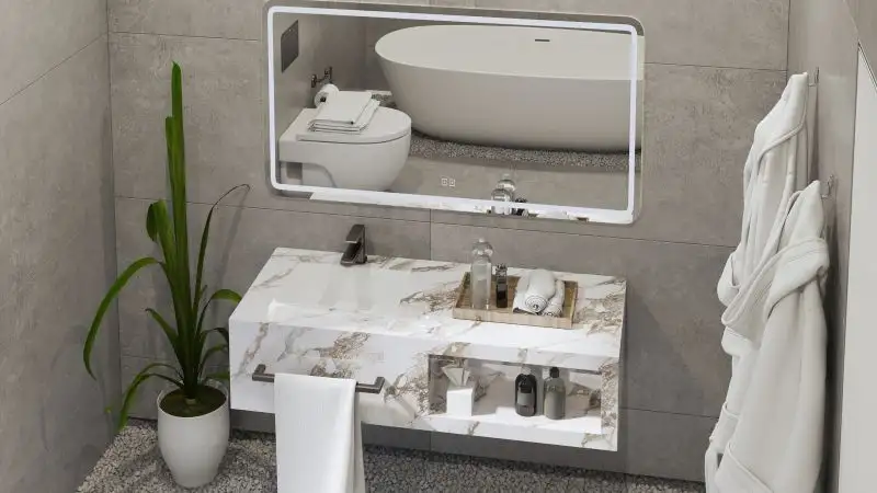 Cu un lavoar ceramic si blat inclus, acest set mobilier baie alb adauga un aspect fresh intregului spatiu.