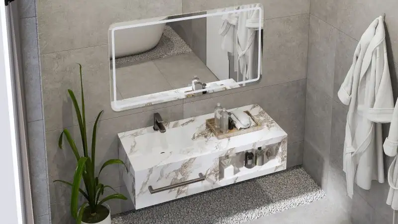 Mai ales daca ai o baie spatioasa, acest set mobilier de baie cu lavoar pe blat are o dimensiune de 80 cm x 48 cm x 30 cm. In plus, este si suspendat ceea ce inseamna ca economiseste spatiu si lasa o prima impresie buna, atunci cand intri in incapere.