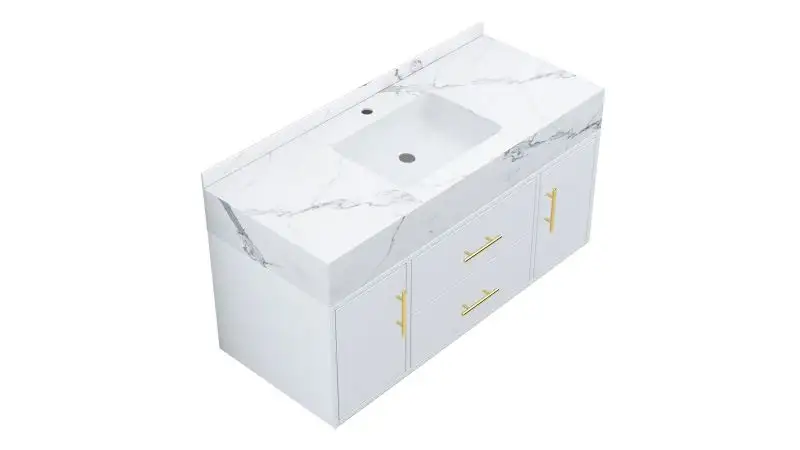 Blatul din compozit ceramic, cu dimensiuni de 90x15x50 cm, este pregatit pentru montajul bateriei sanitare, iar lavoarul ceramic, cu preaplin, este montat sub blat, conferindu-i un aspect elegant si practic in acelasi timp.
