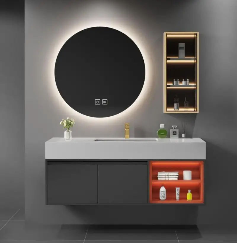 Cu un design modern si finisaj mat in nuante de gri si portocaliu, acest set de mobilier cu lavoar si oglinda LED va aduce un aer fresh si contemporan in intreaga incapere.