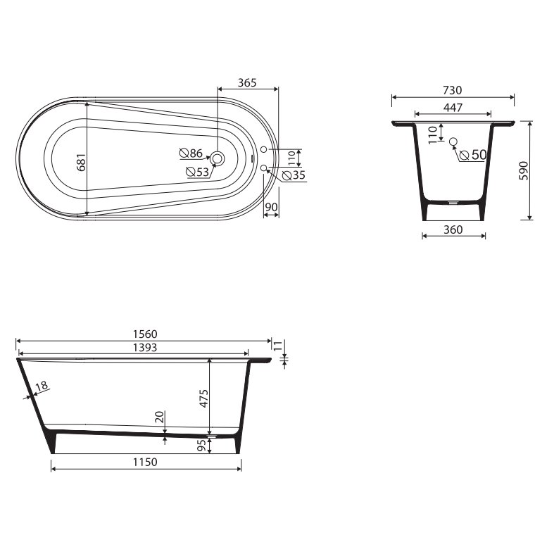 Cada baie freestanding cu dimensiunea 156x73 cm.