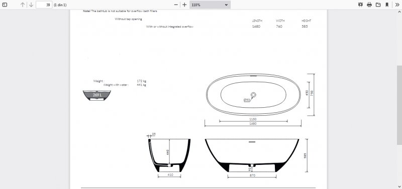 Cada baie freestanding cu dimensiunea 168x75 cm.