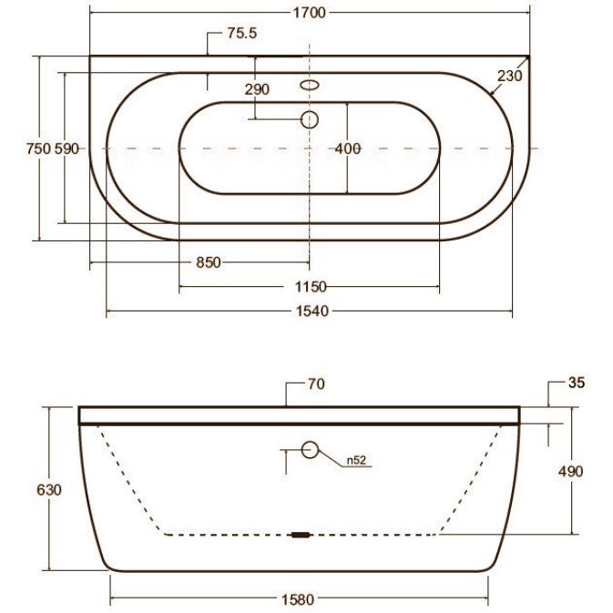 Cada de baie ovala cu dimensiunea de 170x75 cm pentru montare la perete.