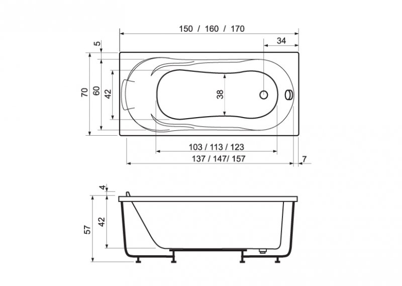 Cada baie rectangulara cu dimensiunea 150 x 70 cm.