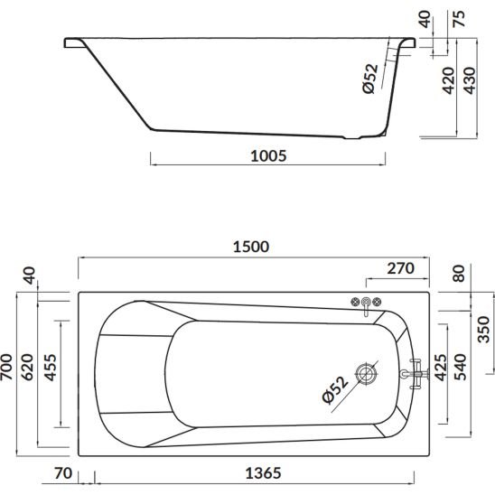 Cada baie rectangulara cu dimensiunea 150 x 70 cm.