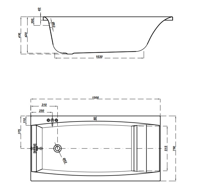 Cada baie rectangulara cu dimensiunea 150 x 75 cm.
