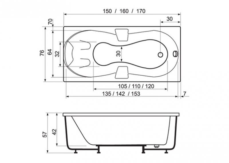 Cada baie rectangulara cu dimensiunea 150 x 76 cm.