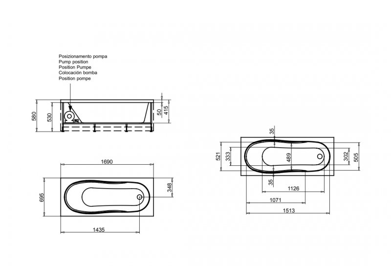 Cada baie dreptunghiulara cu dimensiunea 170 x 70 cm.