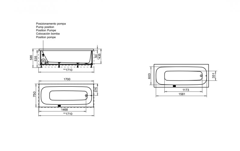 Cada baie dreptunghiulara cu dimensiunea 170 x 70 cm.