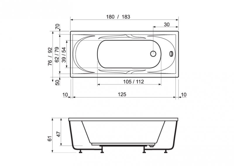 Cada baie dreptunghiulara cu dimensiunea 180 x 76 cm.