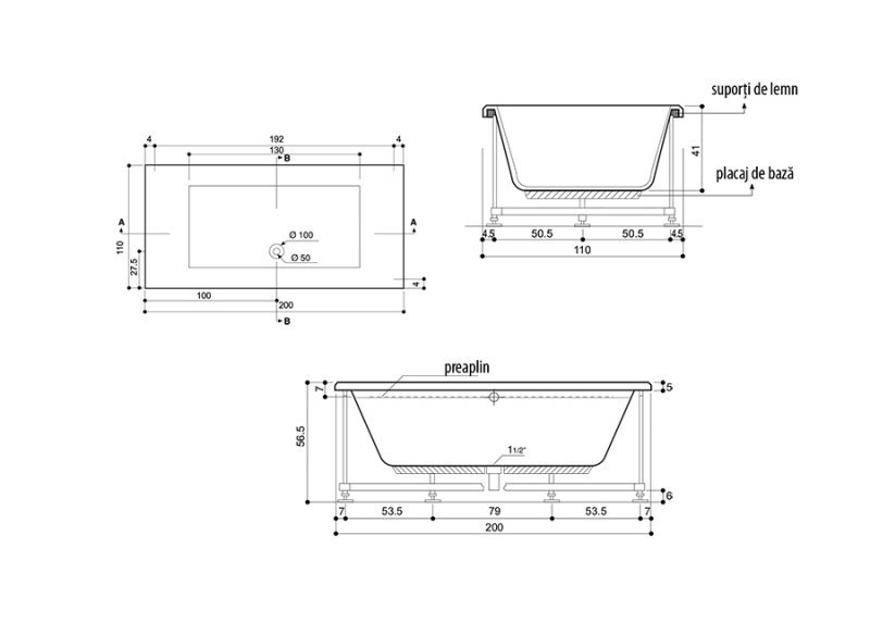 Cada baie rectangulara cu dimensiunea 200 x 110 cm.