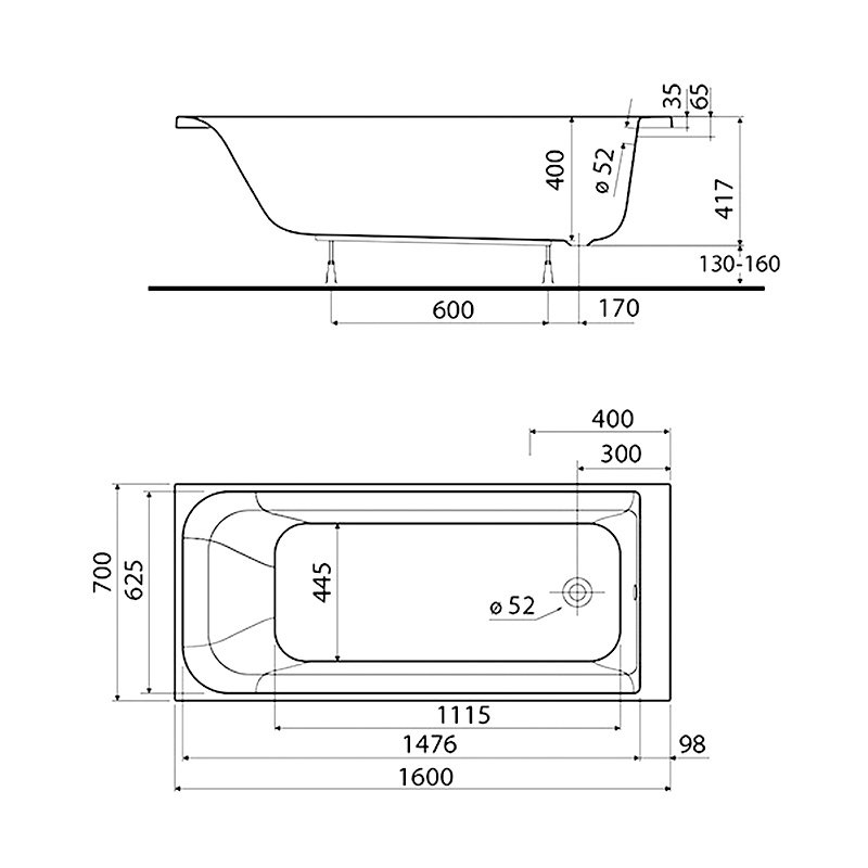 Cada baie rectangulara cu dimensiunea 160 x 70 cm.