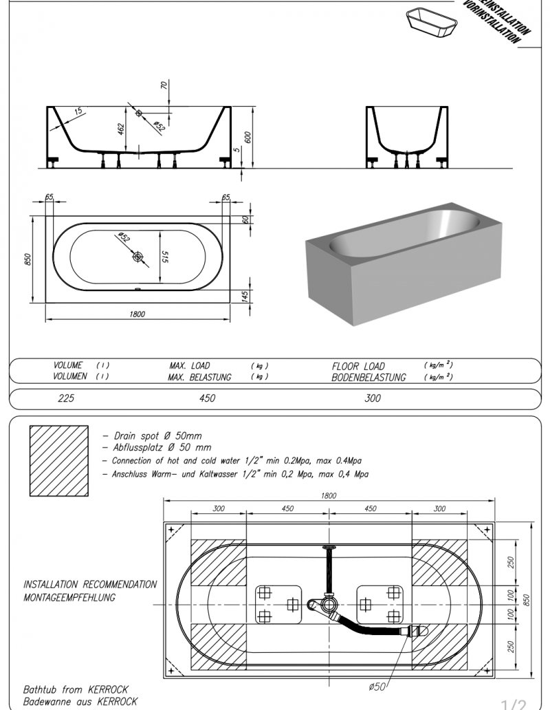 Cada baie freestanding cu dimensiunea 165x85cm.