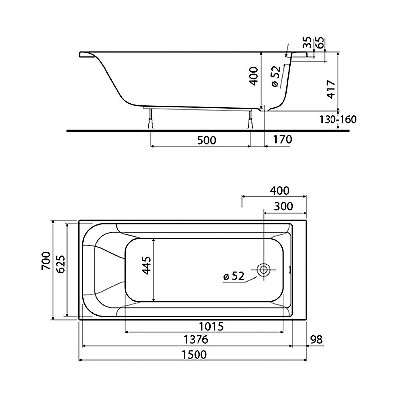 Cada baie rectangulara cu dimensiunea 150 x 70 cm.