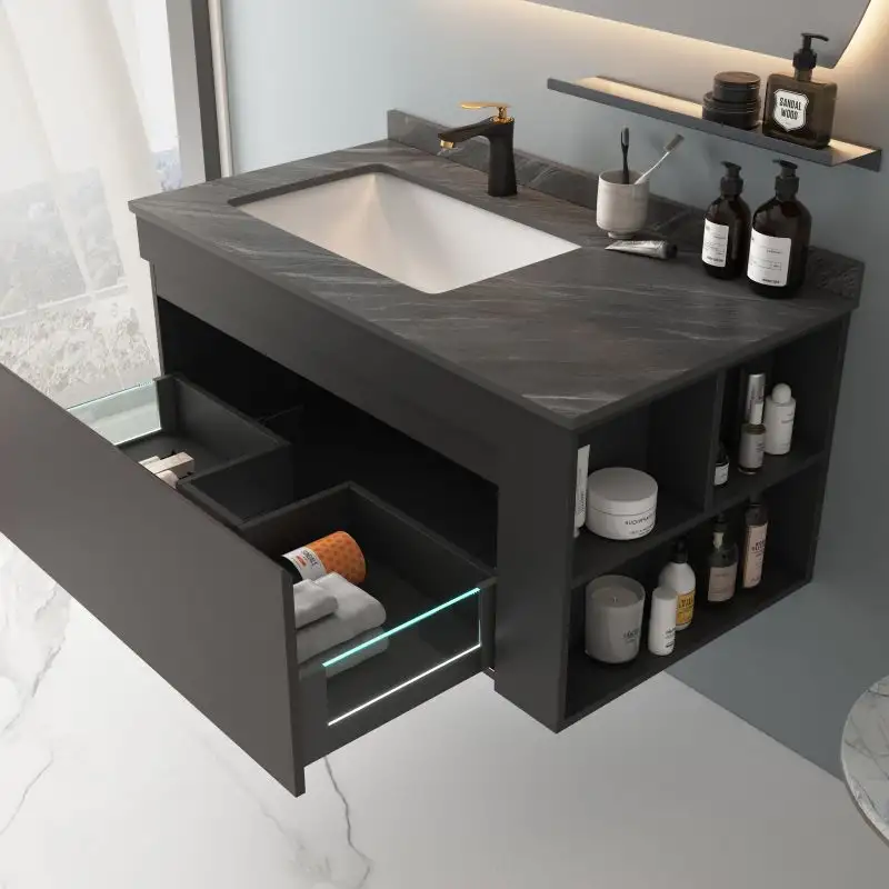 Corpul suspendat al setului de mobilier pentru baie este realizat din placaj hidrofugat, garantand rezistenta la umiditate si durabilitate in timp. Dispune totodata de un sertar cu inchidere lenta, astfel ca ai parte de o experienta sigura si confortabila.