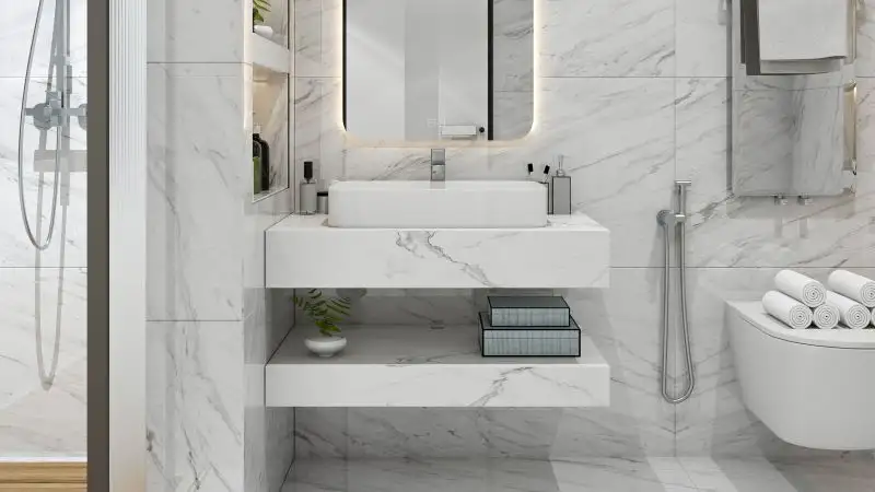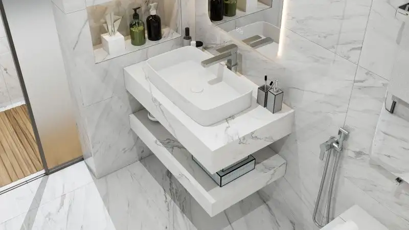 Set mobilier baie suspendat pregaurit, cu doua blaturi, ceramic, alb, marmorat, mat