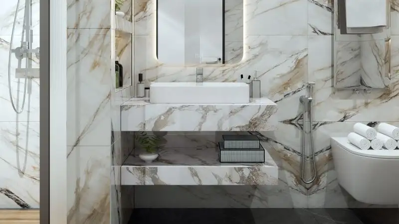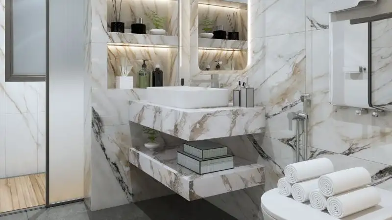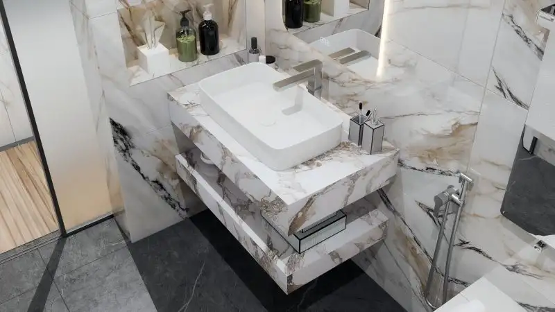 Dimensiunile blatului ceramic, 120cm x 53cm x 20cm pentru partea superioara si 120cm x 53cm x 10cm pentru cea inferioara, asigura spatiu suficient pentru depozitarea produselor de igiena personala si a altor accesorii pentru nevoile tale.