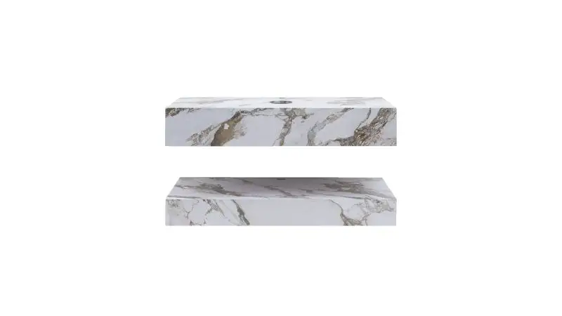 Cu doua blaturi din compozit ceramic, acest set mobilier suspendat iti ofera o solutie completa pentru organizarea baii tale. Blatul superior, prevazut cu orificii pentru lavoar si baterie, iti permite sa montezi aceste elemente cu usurinta si sa beneficiezi de un design impecabil.